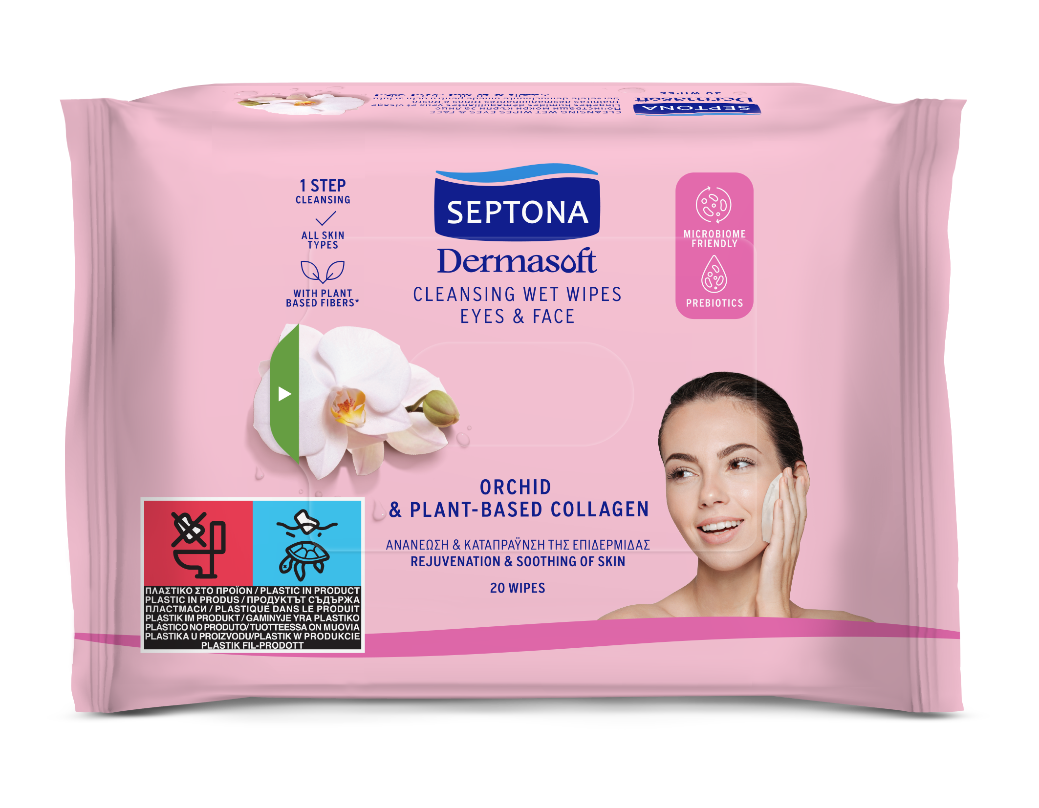 ΠροβολήΥγρά μαντηλάκια καθαρισμού προσώπου & ματιών με ορχιδέα & φυτικό κολλαγόνο 20 τμχ (1+1 Δώρο)