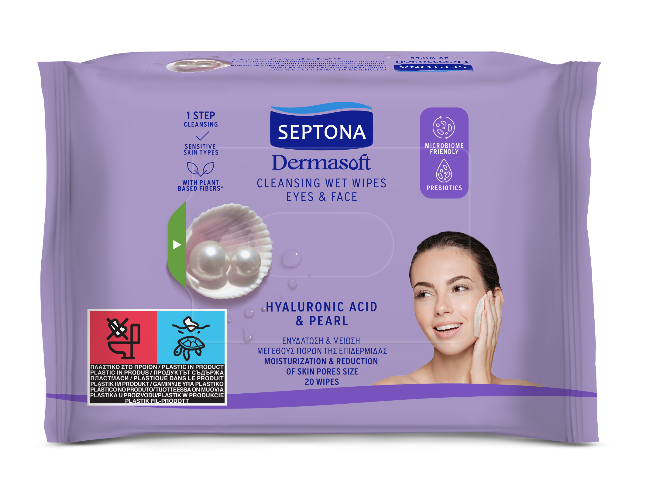 ΠροβολήΥγρά μαντηλάκια καθαρισμού προσώπου & ματιών με υαλουρονικό οξύ & μαργαριτάρι 20 τμχ (1+1 Δώρο)