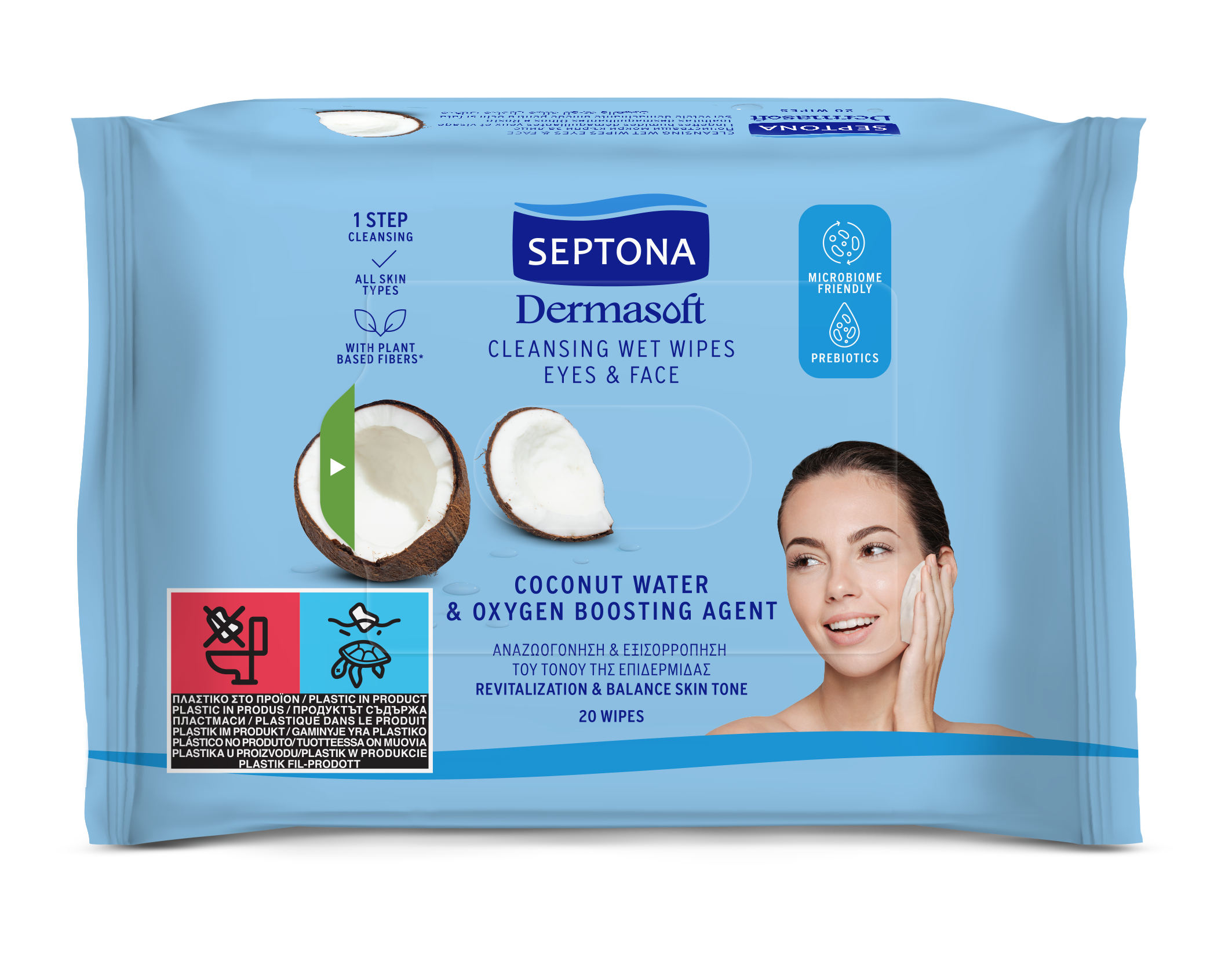 ΠροβολήΥγρά μαντηλάκια καθαρισμού προσώπου & ματιών με νερό καρύδας & παράγοντα οξυγόνωσης 20 τμχ (1+1Δώρο)